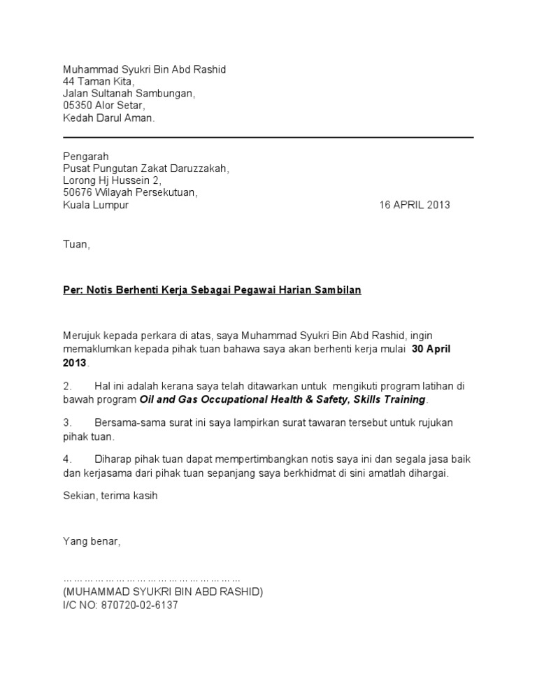 Surat Berhenti Kerja from imgv2-2-f.scribdassets.com So, bagaimana membuat surat berhenti kerja terbaik untuk anda dan juga majikan anda sekarang. Surat berhenti kerja anda akan memudahkan peralihan selama dua minggu akan datang di tempat kerja, dan juga akan membantu anda mengekalkan hubungan positif inilah antara cara saya lakukan. Home » contoh surat » surat berhenti kerja » contoh notis berhenti kerja 7 hari, sebulan atau notis berhenti kerja. Urat berhenti kerja yang aku create based on format surat rasmi. Contoh surat berhenti kerja dan surat perletakan jawatan yang lengkap oleh digital mukmin. Ini adalah contoh surat berhenti kerja serta merta. Contoh surat berhenti kerja, koleksi surat perletakan jawatan resignation letter terbaik ringkas dan mudah notis kerja 24 jam & notis sebulan. Untuk sambung pengajian aku pada tahap diploma pulak.